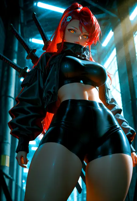 アルターナティブコスチューム、スカルヘアオーナメント、ジャケット、高い襟、開いたジャケット、クロップトップ、お腹部分、黒のショートパンツ、自転車用ショートパンツ、背中に武器,