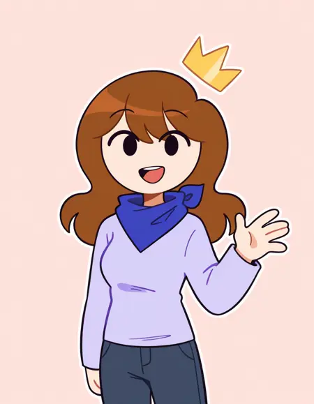 기본값: cengaline_yt, 1girl, solo, 만화, 검은 눈, 홍채 없음, 갈색 머리, 긴 머리, 왕관, 파란색 반다나, 목에 반다나, 보라색 긴 소매, 진한 파란색 바지
