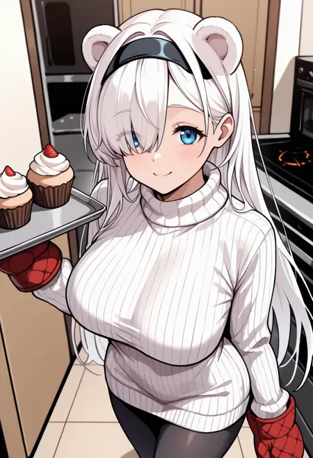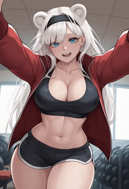 デフォルト衣装: aur0radef, 長い髪, 白髪, 片方の目に髪を垂らす, 黒いヘアバンド, ベア耳, 追加の耳, 青い目, 白いジャケット, クロップドジャケット, 胸元の切り替え, 長い袖, 黒い手袋, 黒いズボン, チャップス, 灰色のショートパンツ, 短いショートパンツ, 感染モニター(arknights), お腹, へそ, 大きい胸