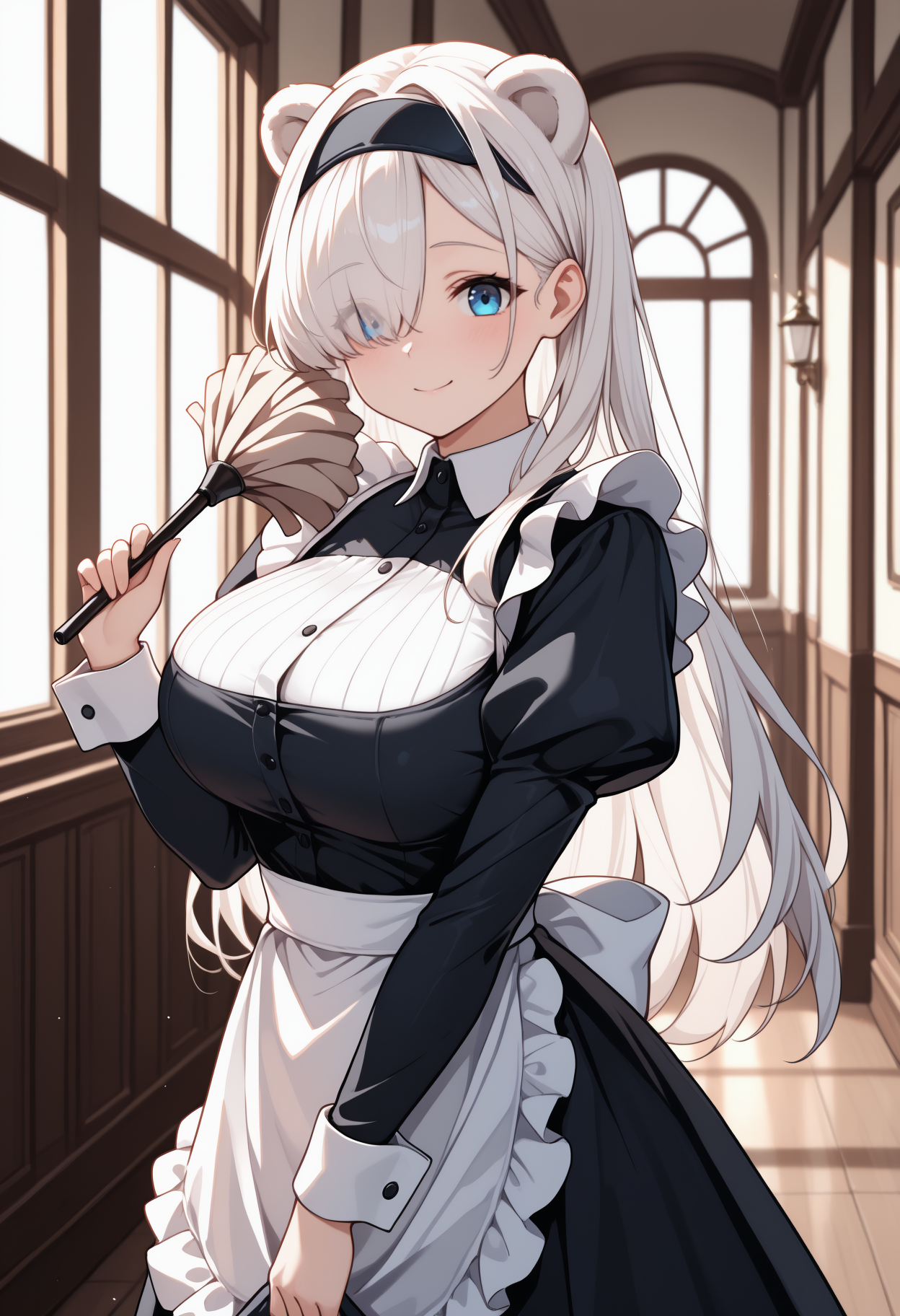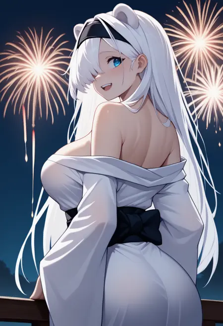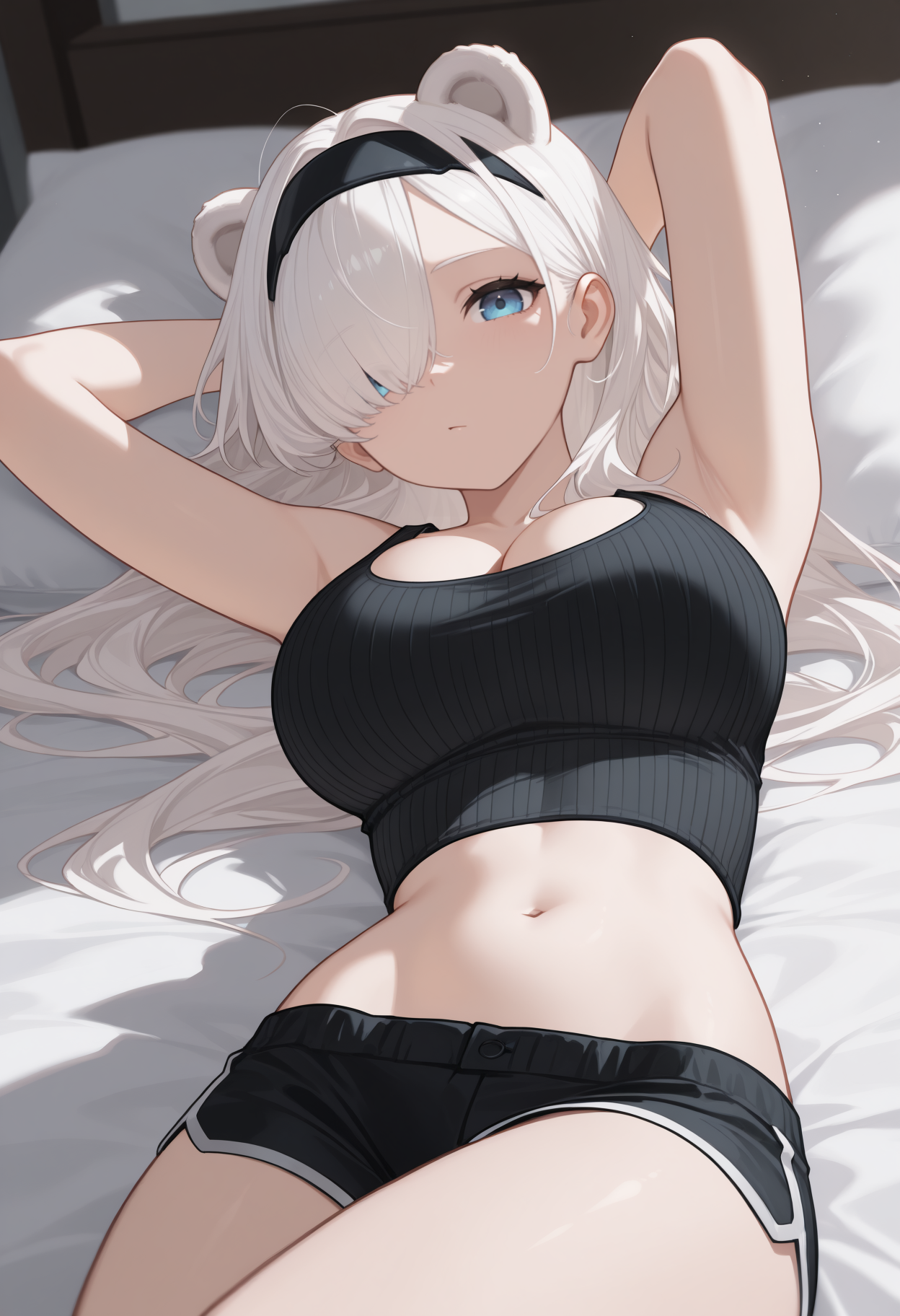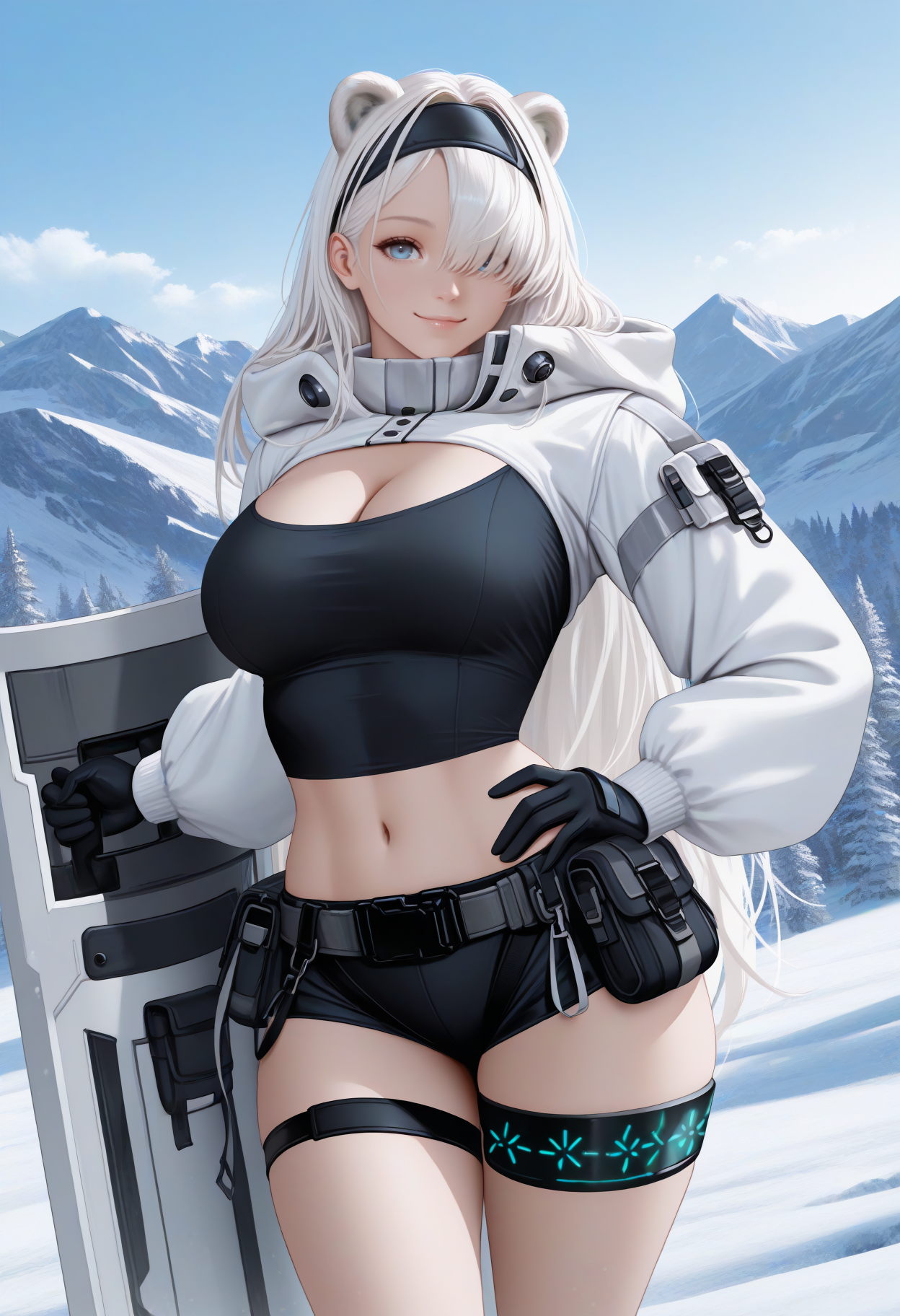 默认服装: aur0radef, 长发, 白发, 头发遮住一只眼睛, 黑色发带, 熊耳, 额外耳朵, 蓝眼睛, 白色夹克, 短款夹克, 露胸剪裁, 长袖, 黑色手套, 黑色长裤, 护腿, 灰色短裤, 短裤, 感染监测器(明日方舟), 腹部, 脐部, 大胸