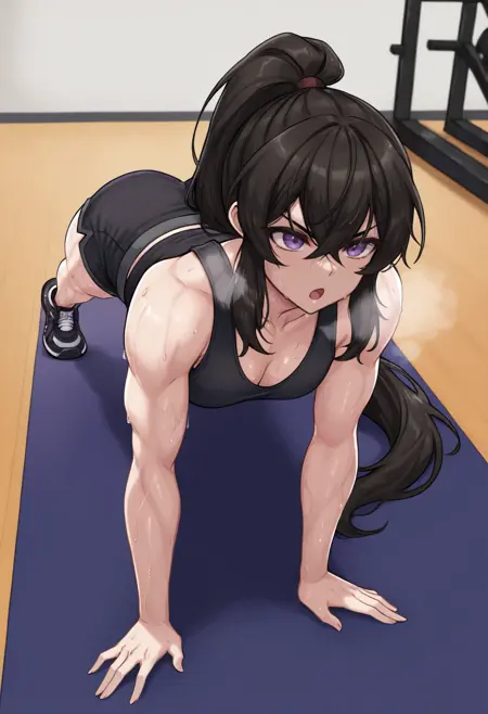 トリガー+外見: ymna, 長い髪, 黒髪, 侧髪, 目の間の髪, ポニーテール, 紫の目