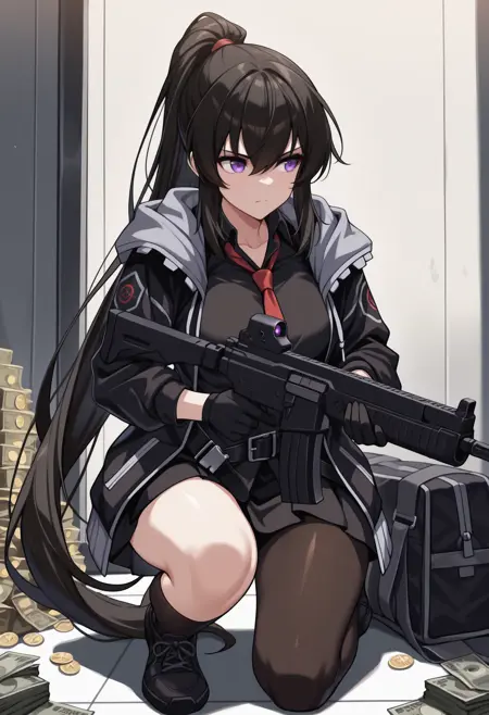 デフォルトの服装: 黒ジャケット, フード付きジャケット, フードを下ろした状態, 開いたジャケット, 長袖, 黒シャツ, リングシャツ, 赤いネクタイ, 黒手袋, 黒スカート, 黒ベルト, 黒パンツタイツ, 片脚用パンツタイツ