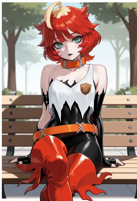 Default Outfit: black bodysuit, emblem, black gloves, elbow gloves, fingerless gloves, orange belt, loose belt, red footwear, thigh boots, orange collar, black nails, bare shoulders, collarbone