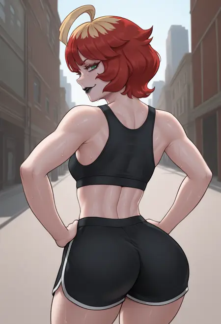 Trigger + Appearance: m3l4, freckles, black lips, short hair, two-tone hair, red hair, blonde hair, ahoge, green eyes, eyelashes