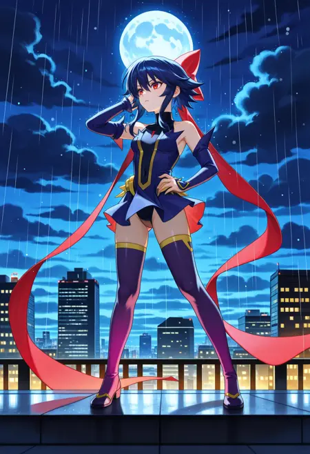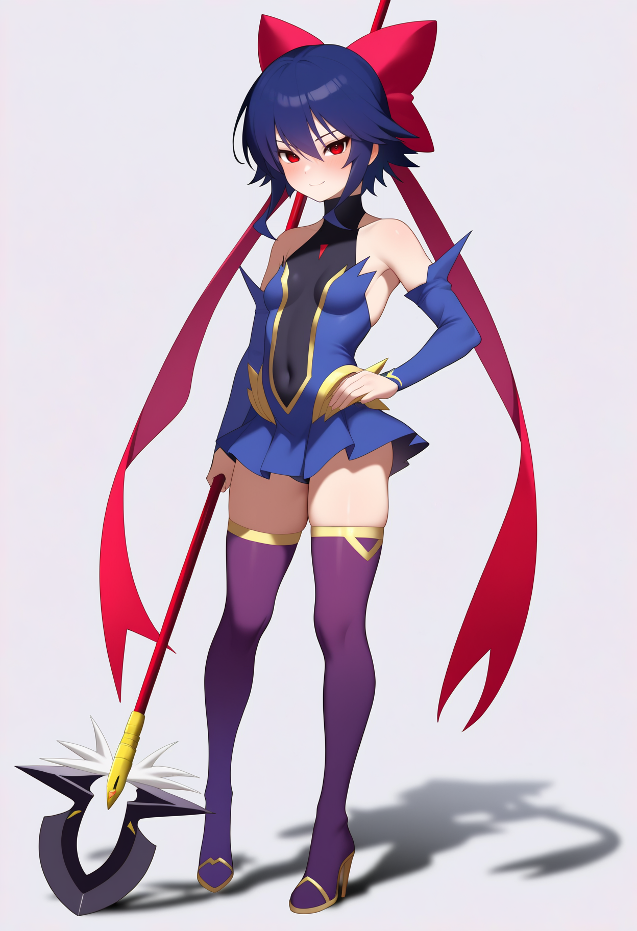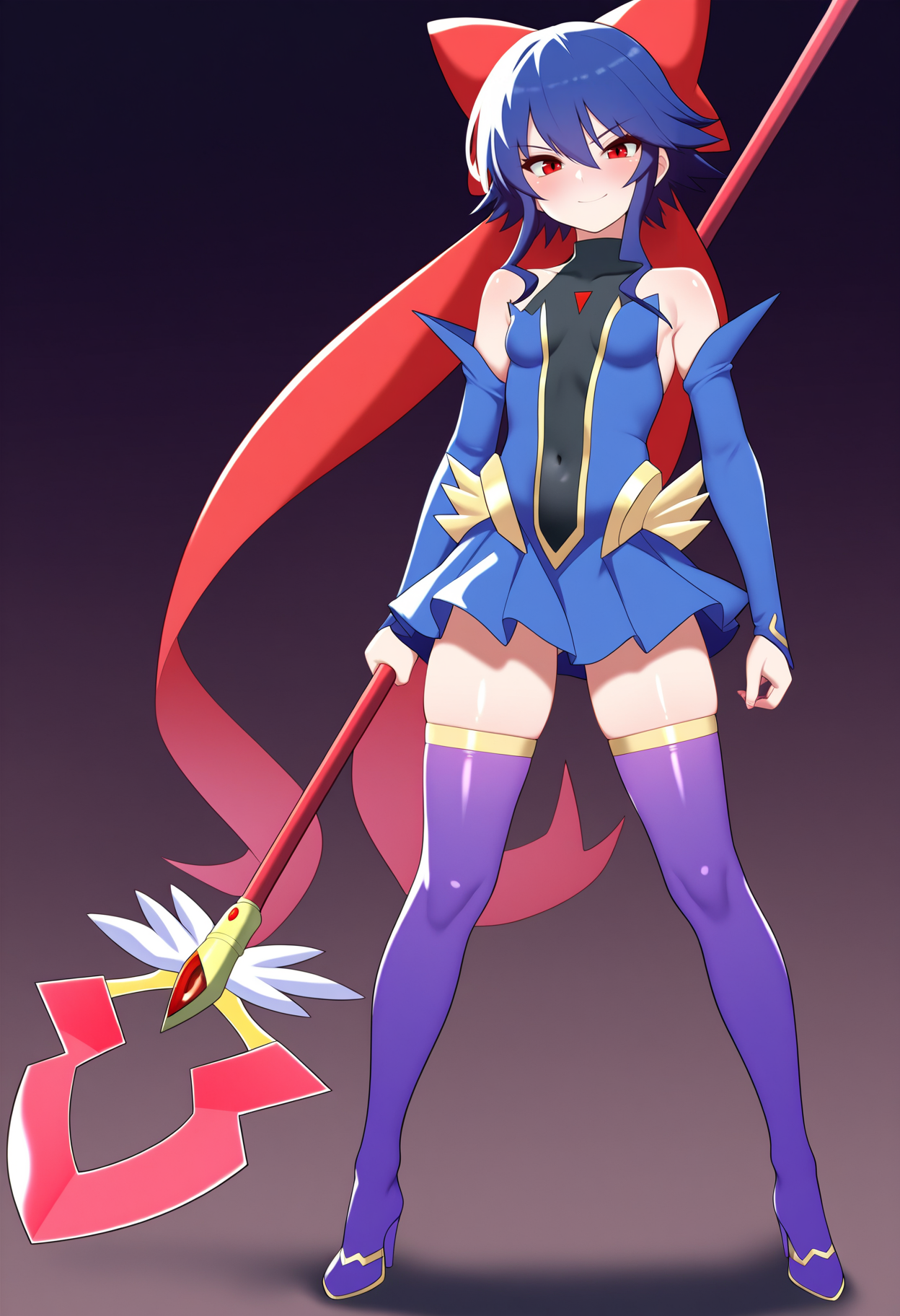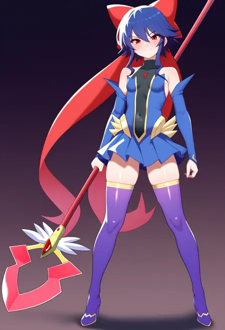 マジカルガール衣装プロンプト:hair bow, hair ribbon, bare shoulders, covered navel, detached sleeves, magical girl, purple thighhighs, skirt, small breasts, thigh boots, high heel boots