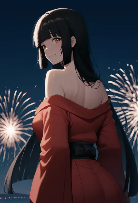 Trigger + Appearance: ykjbm, long hair, black hair, blunt bangs, hime cut, <brown / red eyes>