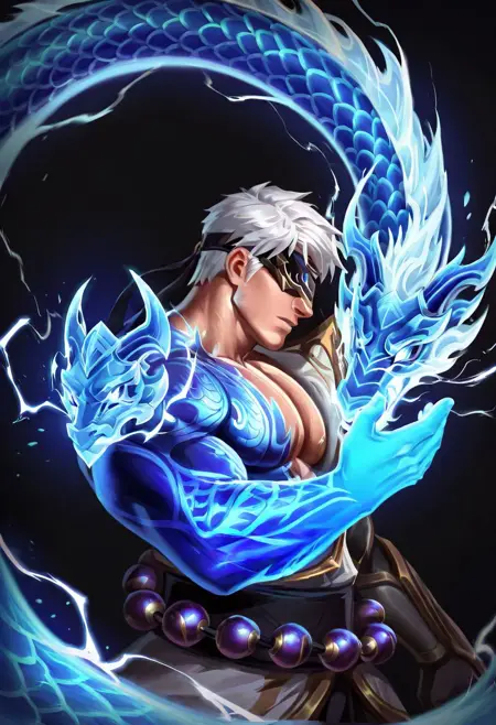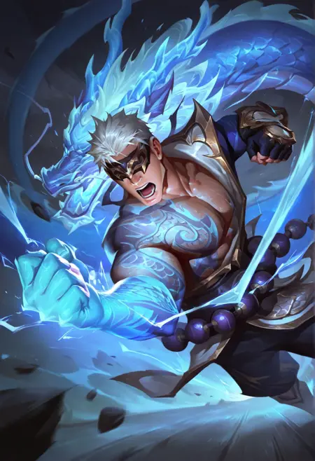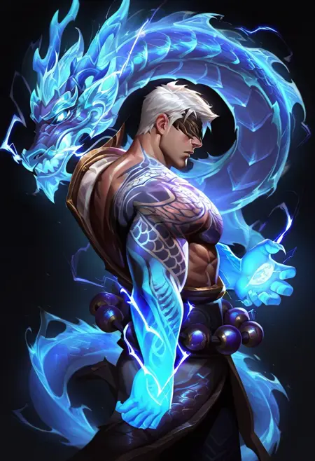 storm-dragon-lee-sin,blue arm,blue eastern dragon,glowing,tattoo,white hair,large beads around waist,blindfold,