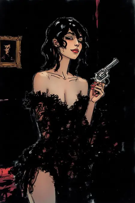 ミニマリストでありながら表現力豊かな白黒インク技法を使い、強い影と太い線を特徴としています。