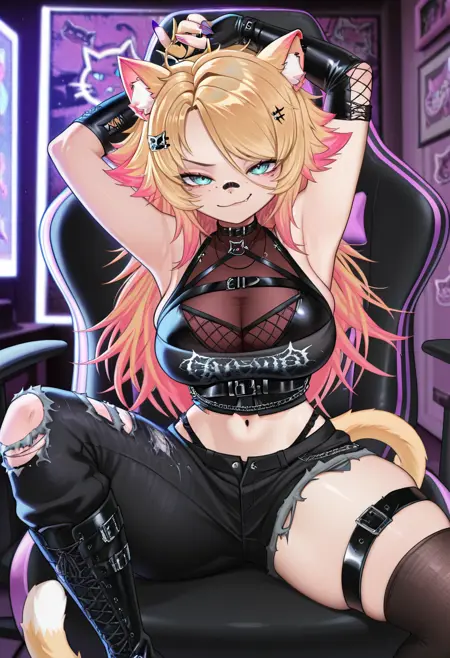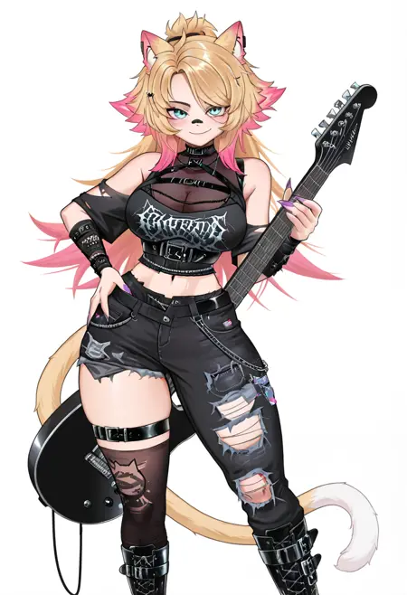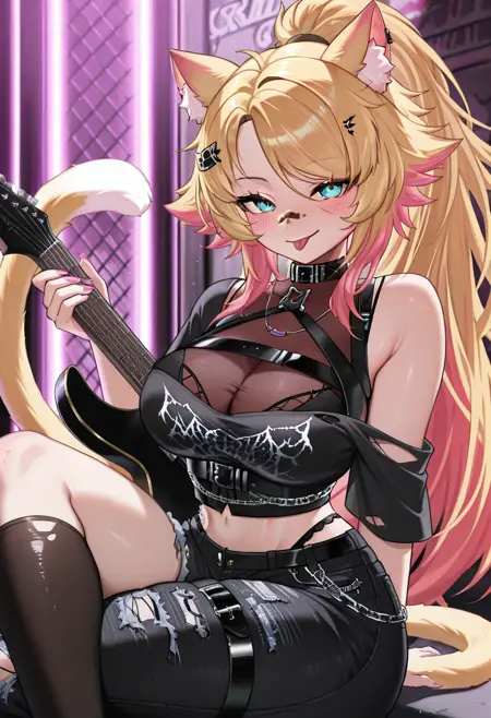 | トレーニングワード | obkati_kat, 1girl, solo, cat girl, punk, animal ears, cat ears, animal ear fluff, blonde hair, pink hair, multicolored hair, gradient hair, colored tips, long hair, hair ornament, hairclip, freckles, bandaid on face, bandaid on nose, blue eyes,コピーしました! breasts, large breasts, cleavage,see-through cleavage,bare shoulders, bra, black bra, halterneck, choker, black choker,コピーしました! navel, midriff, underwear, panties, panty straps, pants, black pants, torn pants, torn jeans, denim, single pantsleg, shirt, black shirt, crop top, torn shirt, fishnet top, tail, cat tail,コピーしました! thighs, skindentation,thigh strap, thighhighs, single thighhigh, kneehighs, belt, black belt, thigh belt, thigh strap, asymmetrical legwear, boots, black footwear, knee boots,コピーしました! fingernails, long fingernails, sharp fingernails,purple nails gloves, black gloves, fingerless gloves,コピーしました! fur trim, clothing cutout,コピーしました! |
