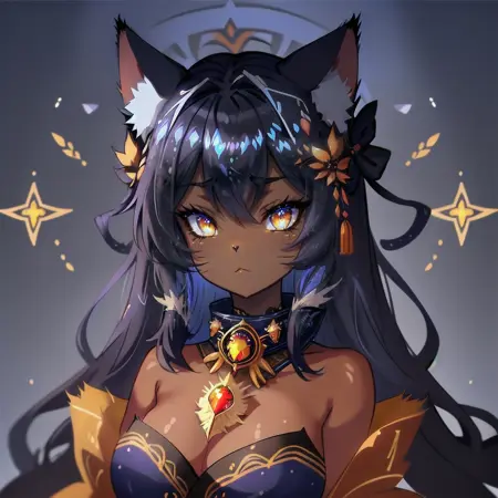 (傑作、最高品質)、(猫のような口吻:1.8)、(猫のような鼻:1.8)、(猫のひげ:1.3)、(正面ビュー:1.5)、(観察者を見つめる:1.5)、(対称的な顔:1.3)、(中央配置:1.3)、正面を向く、ケモノスタイルの成熟した女性キャラクター、輝く目、天体をテーマにした衣装、ファンタジー照明、優雅な着物、細かい刺繍