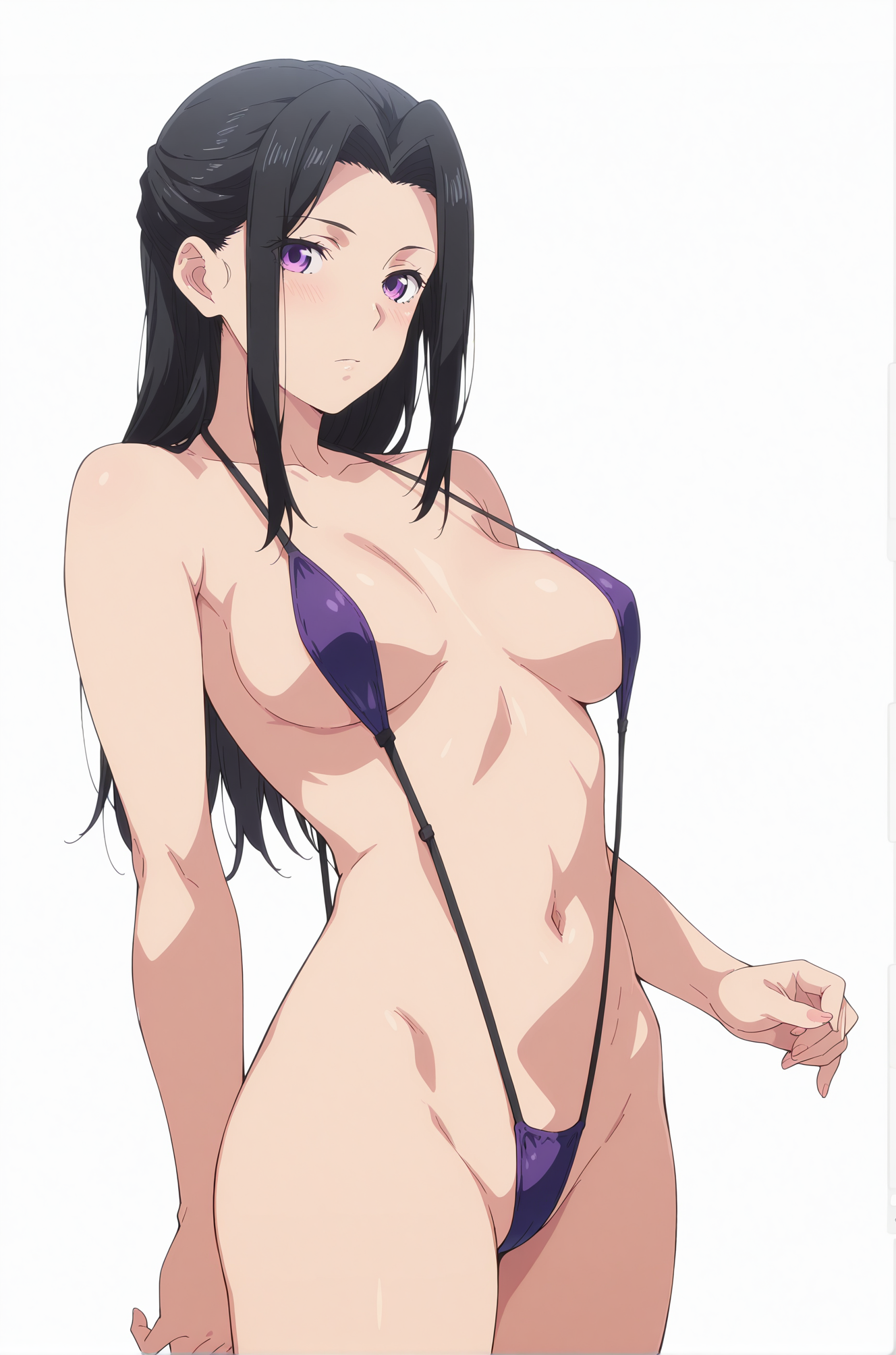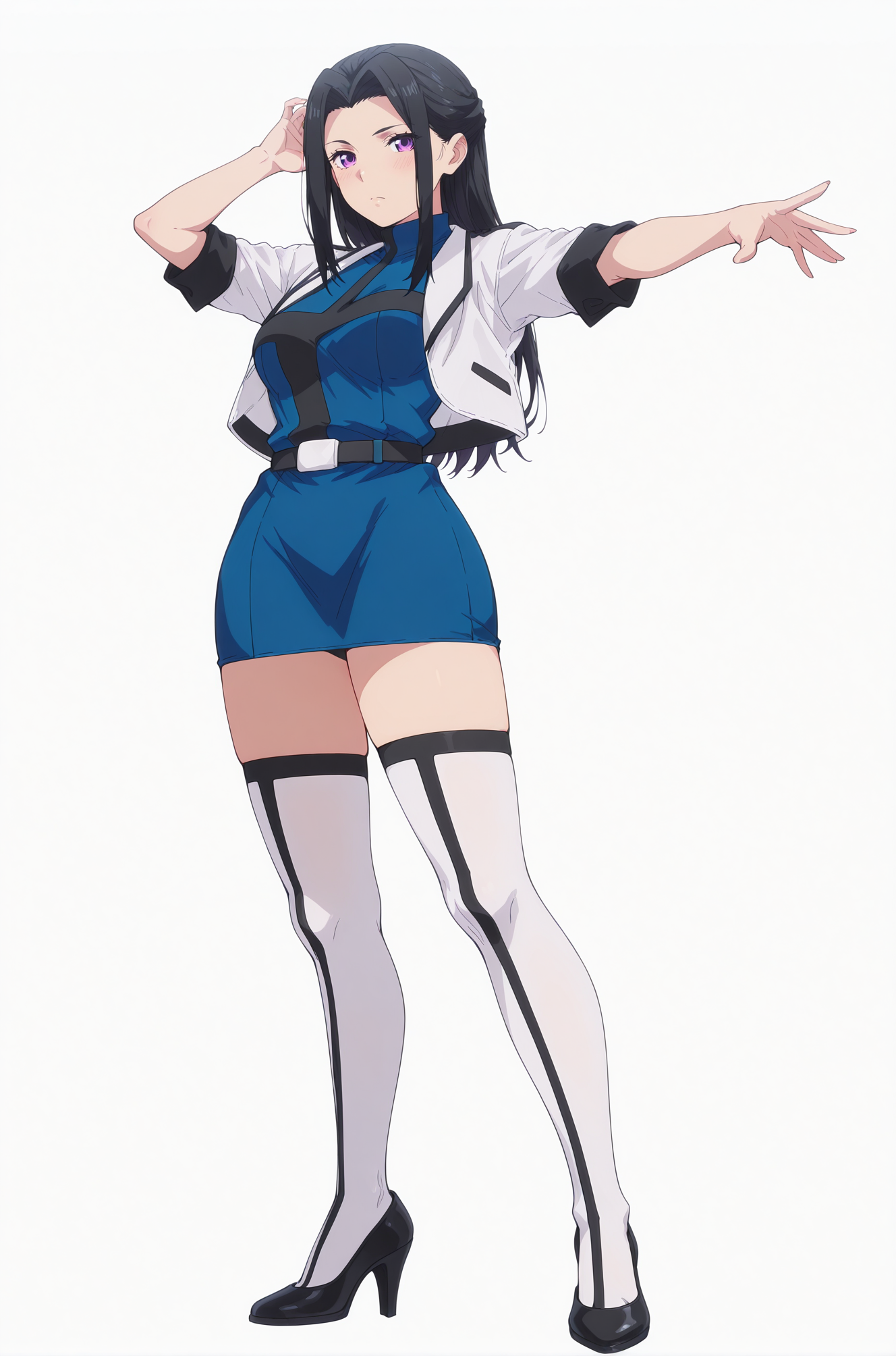 ((动漫上色)), 杰作,最佳质量,惊人质量,rea,1女孩,长发,黑发,紫色眼睛,中等胸部,连衣裙,蓝色连衣裙,夹克,白色夹克,腰带,袖子卷起,过膝袜,白色过膝袜,高跟鞋,单人,姿势,站立,正面视角,看着观众,(((白色背景,简单背景)))