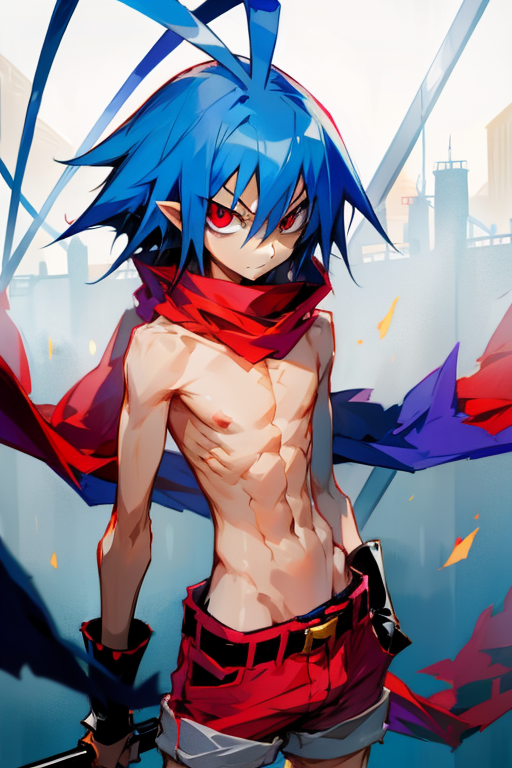 Laharl:laharl (prince)、青髪、アンテナ髪、赤い目、上半身裸、ショートパンツ、スカーフ