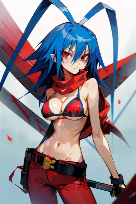 Laharl-chan:laharl-chan、青髪、アンテナ髪、赤い目、大きな胸、ビキニトップのみ、スカーフ、ベルト、赤いパンツ