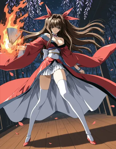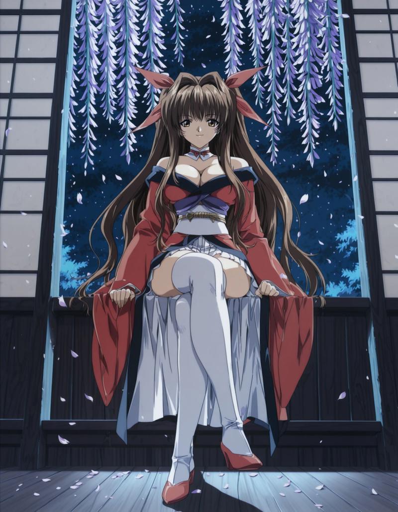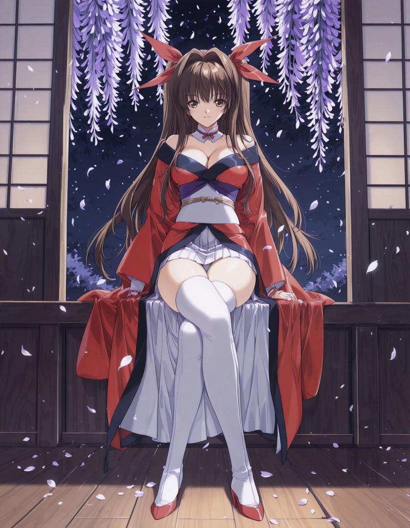 akane_ILV1,1girl,裸露肩膀,蝴蝶结,大腿袜,和服,绝对领域,红色和服,白色大腿袜,腰带,白色裙子,百褶裙,白色内裤,宽袖,(长裙:0.8),(发带:0.8),(高跟鞋:0.8),大胸,(棕色头发:0.9),