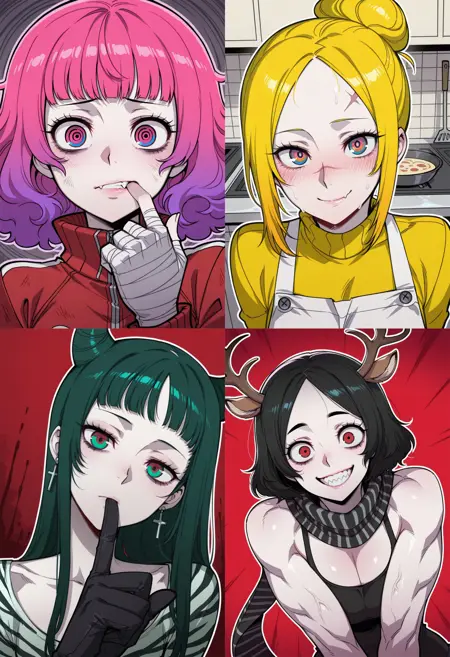 Simple and minimalistic style, flat color, no outlines. Good with mythical, fairy tale and fantasy themes. Works well (probably😳) with characters of various fantasy races (including orcs, goblins, anthropomorphic animals, dragon people, lovecraftian monster girls, etc) and different skin colors. Trained on ancient Greek, ancient Egyptian, and medieval themed images, among others.