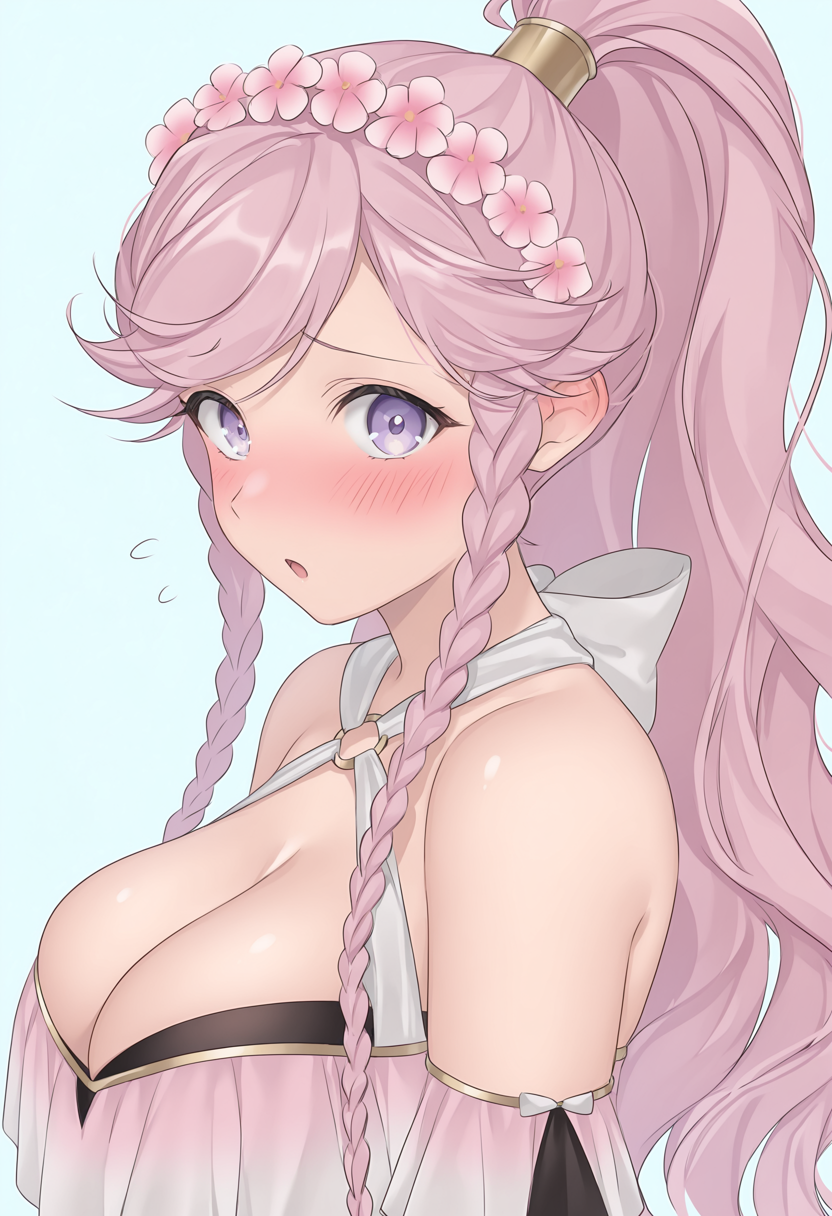 olspf, 1girl, 분홍색 머리, 긴 머리, 더블 브레이드, 포니테일, 보라색 눈, 머리 장식, 꽃, 샌들, 가슴선, 가슴