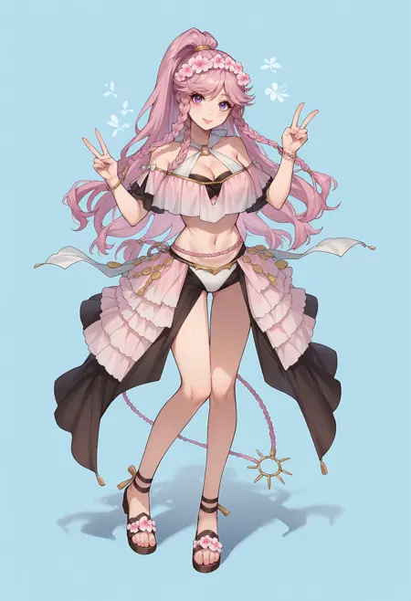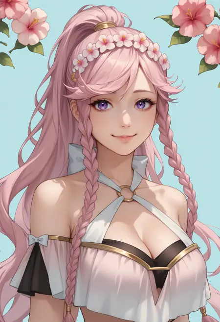 olspf, 1girl, 粉色头发, 长发, 双马尾, 马尾辫, 紫色眼睛, 发饰, 花朵, 凉鞋, 暴露胸部, 乳房
