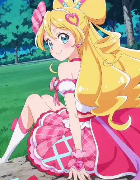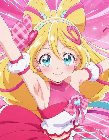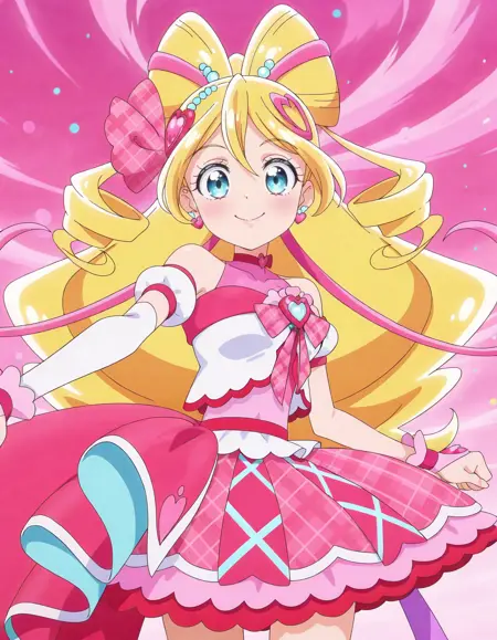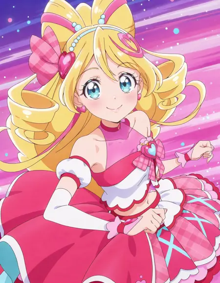 score_9, score_8_up, score_7_up, source anime, absurdres, solo, 1girl, anime screencap, cureidol, pink skirt, skirt, jewelry, earrings, navel, pink bow, midriff, magical girl, bow, heart, plaid, hair ornament, idol lora:cureidol_pony:0.8