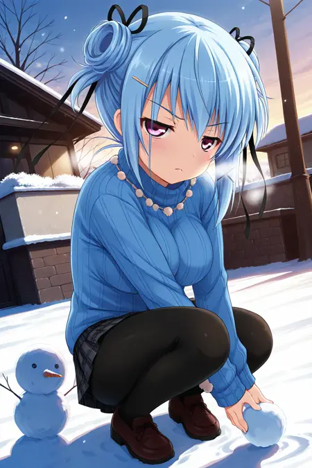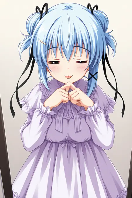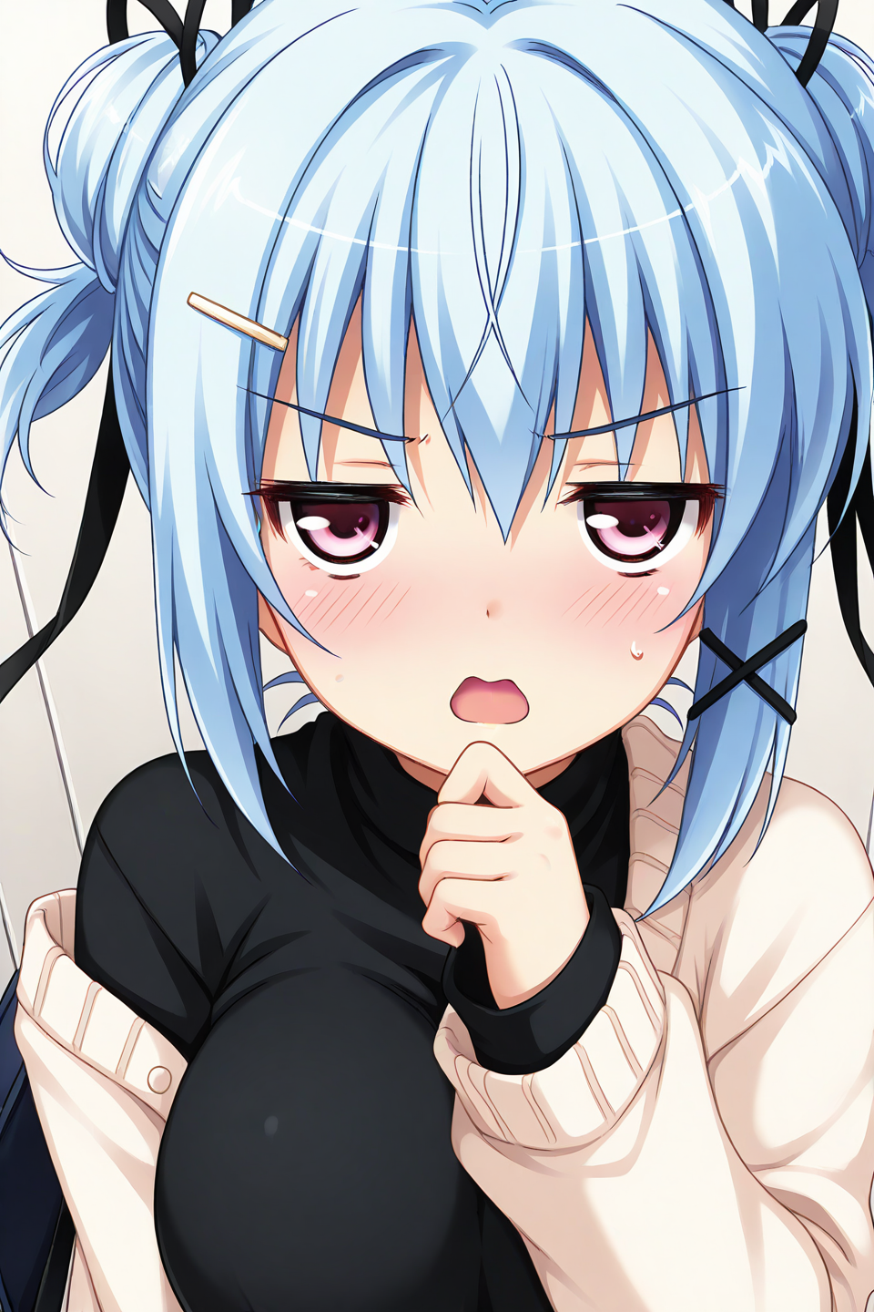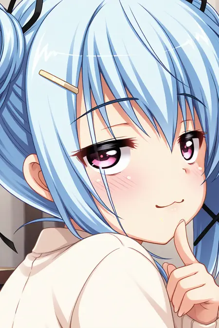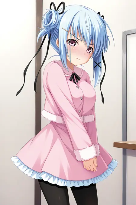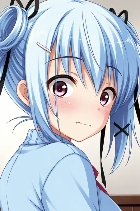 kinomoto hana,pink eyes,blue hair,light blue hair,short hair,hair bun,double bun,hair ribbon,black ribbon,hairclip,hair ornament,large breasts,