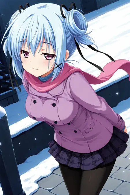 casual,winter clothes,scarf,pink scarf,pom pom,ribbon,coat,winter coat,purple coat,buttons,double-breasted,sweater,turtleneck,blue sweater,ribbed sweater,long sleeves,skirt,pleated skirt,purple skirt,miniskirt,pantyhose,black pantyhose,
