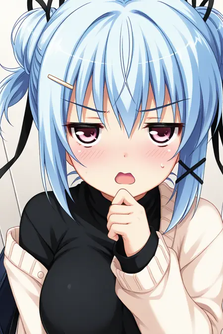 blush, 3:, closed mouth, embarrassed, frown, looking at viewer, nervous, nose blush, sweat, sweatdrop, v-shaped eyebrows, wavy mouth
