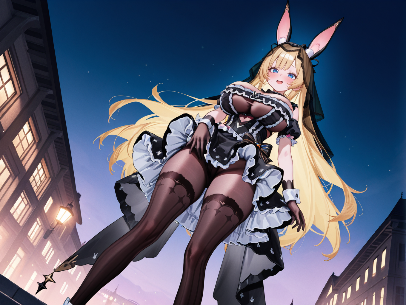 | トレーニングワード | LPS,1girl,breasts,solo,gloves,blue eyes,long hair,blonde hair,animal ears,official alternate costume,looking at viewer,rabbit ears,thighhighs,black veil,black gloves,large breasts,black dress,fake animal ears,((see-through:1.2)),frills,cleavage,very long hair,black bodystocking,pantyhose,legs,standing,virtual youtuber,white footwear,コピーしました! |
