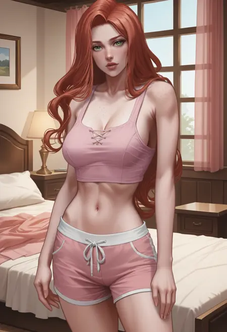 メインタグ:1girl、solo、緑の目、赤髪、長い髪、そばかす、胸、大きい胸、