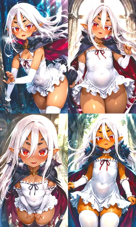 衣装プロンプト: (白いショートドレス、胸元のリボン、長い黒いマント、指先が開いた白いアームウォーマー)