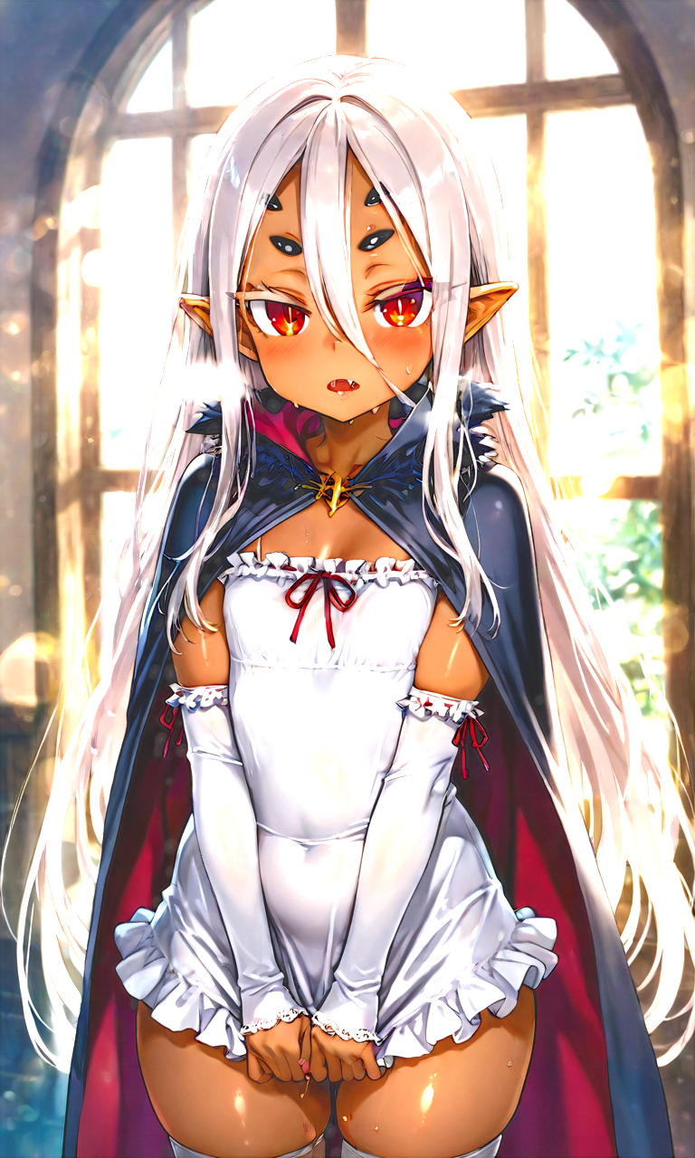 <(taimanin anemone, 귀여운 소녀, 거미 소녀, 검은 피부를 가진 여자, 갈색 피부, 윤기 나는 피부, 피부 텍스처, 표현력 풍부한 얼굴, 매우 긴 흰색 머리, 눈 사이의 머리, 뾰족한 귀, 송곳니, 붉은 눈, 수직 동공, 손톱, 입술, 6개의 추가적인 어두운 눈, 두꺼운 허벅지)>