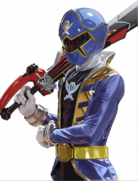 블루 레인지어: gokaiblue, robot, solo, gokaiblue helmet, black gokai bodysuit, gokaiblue jacket, black pants, gold belt, white gloves, blue boots