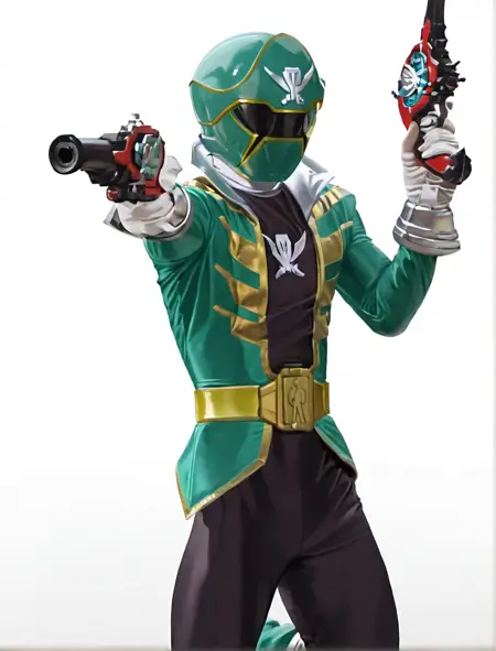 그린 레인지어: gokaigreen, robot, solo, gokaigreen helmet, black gokai bodysuit, gokaigreen jacket, black pants, gold belt, white gloves, green boots