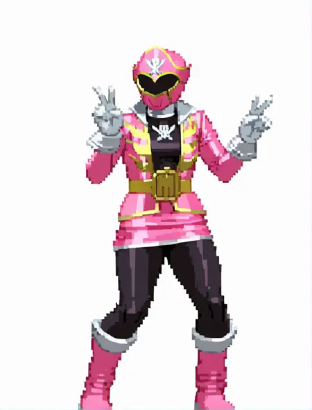 ピン크 레인지어: gokaipink, robot, solo, gokaipink helmet, black gokai bodysuit, gokaipink jacket, breasts, pink skirt, black pants, gold belt, white gloves, pink boots