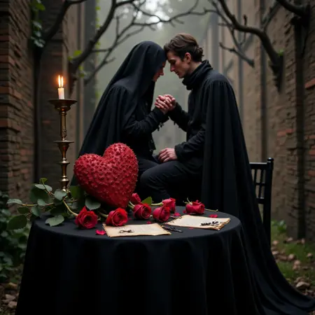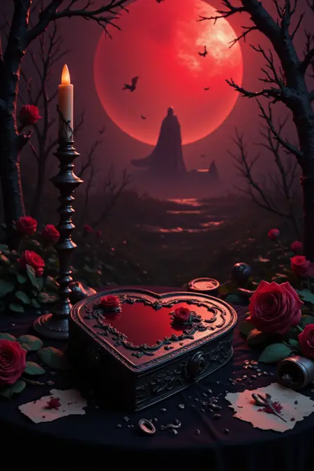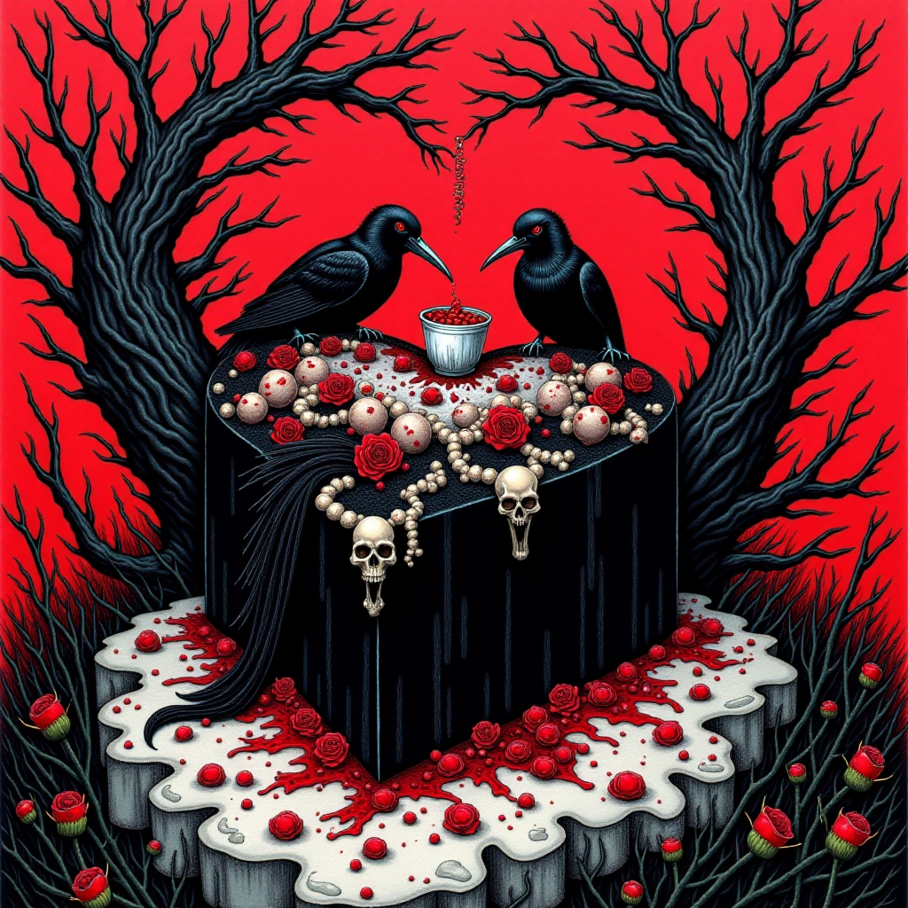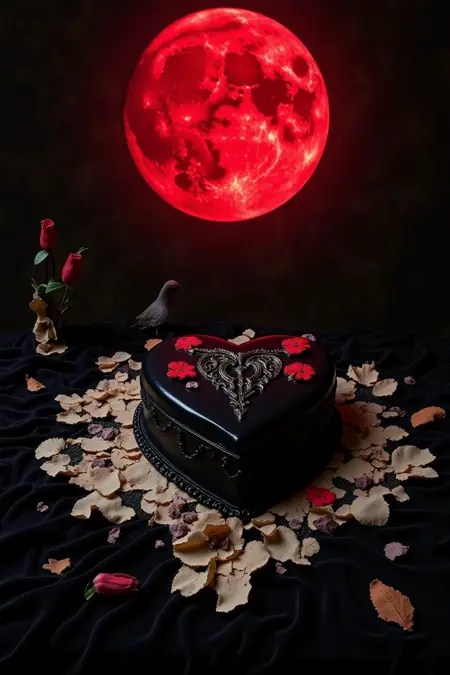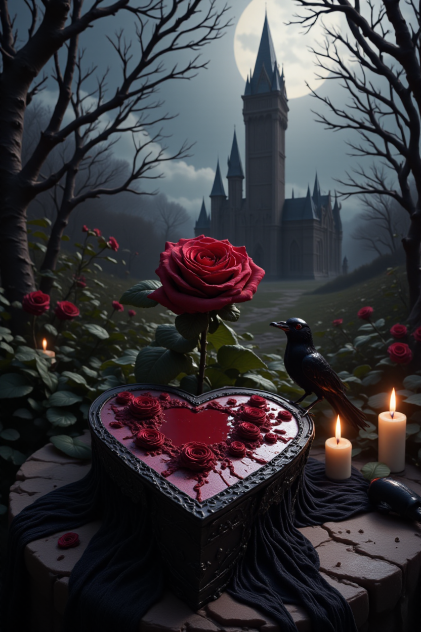あなたの最も好きなBTGGに、最高の方法でバレンタインデーの挨拶をしましょう。黒いハート型のチョコレートケーキの上に、赤いバラの花びらを血の雫のように散らし、それは黒いベルベットで覆われた祭壇石の上に置かれています。