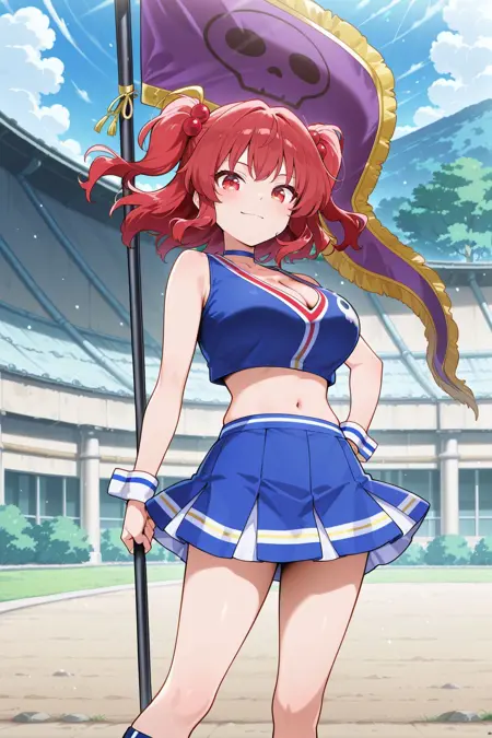 onozuka komachi, 1girl, solo, red hair, short hair, red eyes, two side up, hair ornament, large breasts, alternate costume, blue skirt, blue top, blue boots, skeletton print top, cheerleader, choker, cleavage, crop top, hair ornament, holding flag, midriff, miniskirt, navel, skirt, sleeveless,