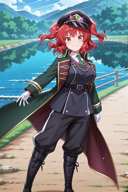onozuka komachi, 1girl, solo, red eyes, red hair, two side up, onozuka komachi \(underground waste ward ticket puncher\), alternate costume, peaked cap, black hat, hair ornament, hair bobbles, red bobbles, green necktie, necklace, coin purse, green coat, open coat, long sleeves, black uniform, collared shirt, white shirt, white gloves, black pants, black boots, lace-up boots, holding hammer, holding ticket,