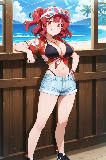onozuka komachi, 1girl, solo, red eyes, red hair, two side up, onozuka komachi \(beach ferrywoman\), alternate costume, visor cap, hair bobbles, red bobbles, necklace, cleavage, red shirt, tied shirt, short sleeves, print shirt, hibiscus print, swimsuit, bikini under clothes, black bikini, navel, highleg bikini, denim shorts, blue shorts, black shoes,