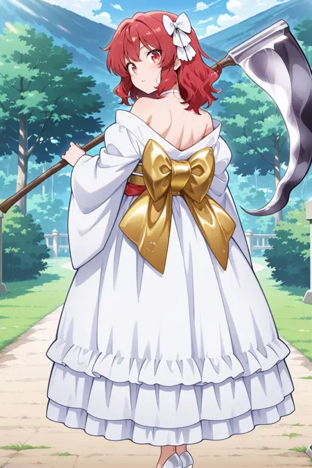 onozuka komachi, 1girl, solo, red eyes, red hair, medium hair, wavy hair,, onozuka komachi \(bold white boat rower\), alternate costume, alternate hairstyle, hair bow, white bow, white choker, wedding dress, white dress, long sleeves, wide sleeves, off-shoulder dress, frilled dress, gold obi, red obijime, back bow, yellow bow, high heels, holding scythe, silver scythe,