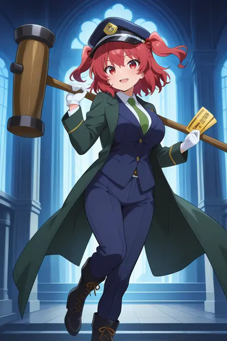onozuka komachi, 1girl, solo, red hair, short hair, red eyes, two side up, hair ornament, large breasts, onozuka komachi \(underground waste ward ticket puncher\), alternate costume, dark green coat, dark blue interior coat, open coat, black footwear, dark blue hat, peaked cap, dark blue pants, boots, collared shirt, gloves, green necktie, hair bobbles, hair ornament, hat, holding hammer, holding ticket, jacket, long sleeves, necktie, dark blue uniform, white shirt, pants, shirt, white gloves, oversized hammer,