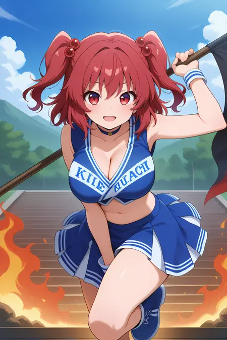 onozuka komachi, 1girl, solo, red hair, short hair, red eyes, two side up, hair ornament, large breasts, alternate costume, blue skirt, blue top, blue boots, skeletton print top, cheerleader, choker, cleavage, crop top, hair ornament, holding flag, midriff, miniskirt, navel, skirt, sleeveless,