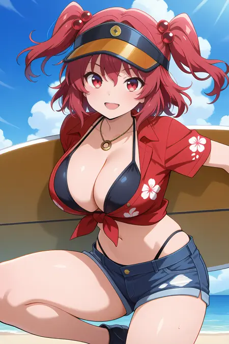 onozuka komachi, 1girl, solo, red hair, short hair, red eyes, two side up, hair ornament, large breasts, onozuka komachi, onozuka komachi \(beach ferrywoman\), alternate costume, bare legs, bikini, bikini under clothes, black bikini, black footwear, blue shorts, cleavage, denim shorts, floral print, hibiscus print, hair bobbles, hair ornament, hat, highleg bikini, navel, necklace, print shirt, red shirt, shirt, shoes, short sleeves, sunglasses, surfboard, swimsuit, thighs, tied shirt, visor cap,