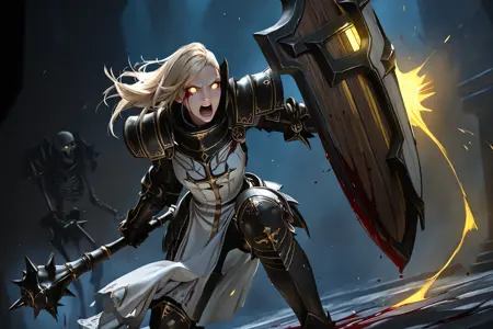 《暗黑破坏神3》中的女性圣骑士。具体效果取决于模型,战锤的表现如何。