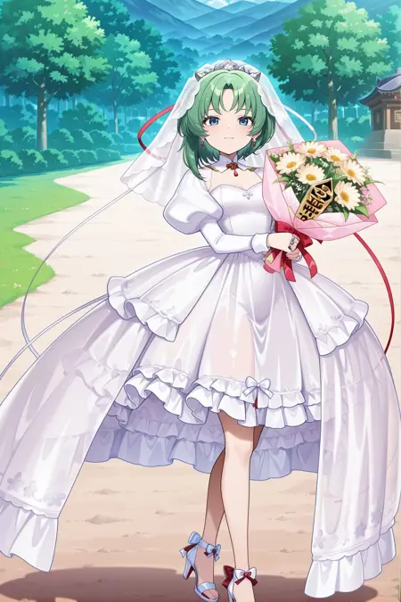 shiki eiki, 1girl, solo, blue eyes, green hair, medium hair, asymmetrical hair, shiki eiki \(unambiguously white judgment\), alternate costume, bridal veil, see-through veil, silver crown, earrings, jewelry, white collar, dateched collar, white dress, wedding dress, frilled dress, long sleeves, silver ring, high heels, white sandals, holding bouquet, rod of remorse,