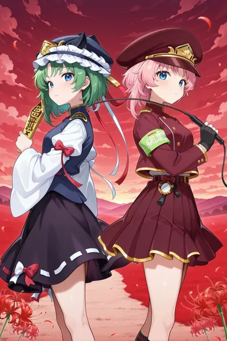 shiki eiki, 1girl, solo, blue eyes, green hair, medium hair, asymmetrical hair, small breasts, shiki eiki \(underground waste ward depot master\), alternate costume, black hat, peaked cap, pink bowtie, cross ornament, shoulder sash, pink sash, open coat, red coat, collared coat, high collar, coat on shoulders, gold trims, black shirt, uniform, long sleeves, white gloves, black belt, black skirt, long skirt, pencil skirt, black thighhighs, black boots, key, holding whip stick,