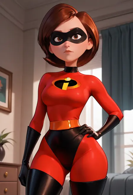 복장: 1girl, helenp, helen parr, elastigirl, 갈색 머리, 갈색 눈, 도미노 마스크, 마스크, 빨간 바디수트, 검은 하이레그 쇼츠, 주황색 벨트, 검은 팔장갑, 검은 허벅지 부츠, 넓은 엉덩이, 중간 크기의 가슴