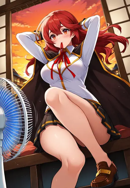 school uniform, collared shirt, skirt, cape, brown footwear,