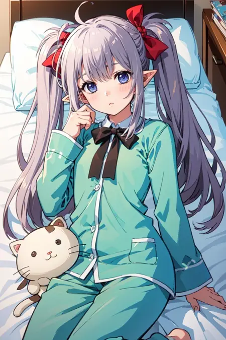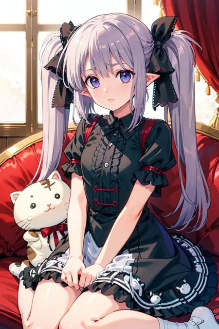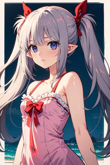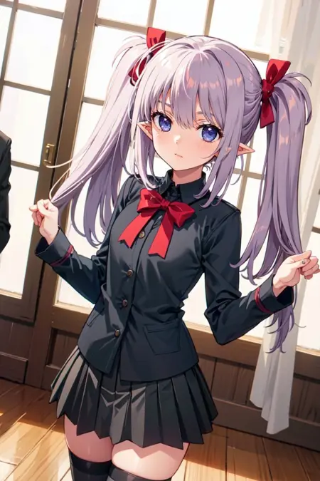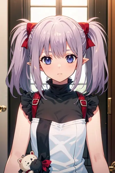 要呈现她的原版服装,请使用以下标签:pikkyprimula, 1girl, solo, looking at viewer, purple hair, grey hair, long hair, twintails, two side up, bangs, blue eyes, breasts, small breasts, ribbon, thighhighs, pointy ears, zettai ryouiki, dress, white thighhighs