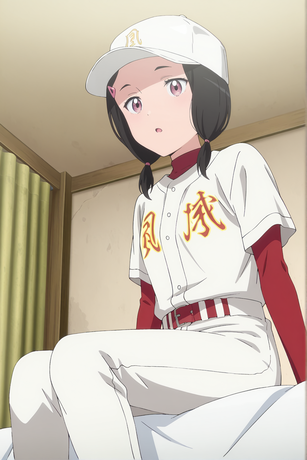 Baseball: chisato-fu, chisato-baseball, 1girl, hair ornament, black hair, twintails, hairclip, soft rose-pink eyes, gentle and rounded shape, sportswear, baseball uniform, long sleeves, layered sleeves, short over long sleeves, belt, white pants, pants