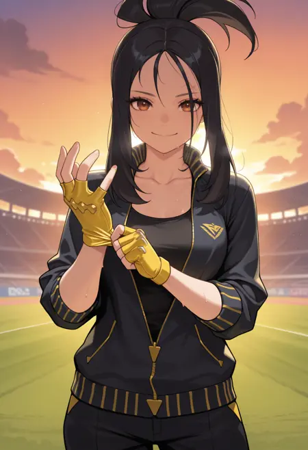 Default Outfit: black jacket, track jacket, zipper pull tab, sleeves past elbows, yellow gloves, fingerless gloves, black pants