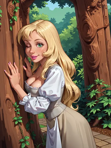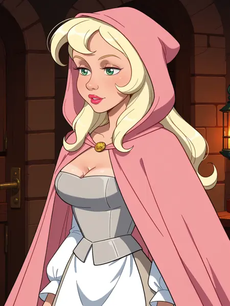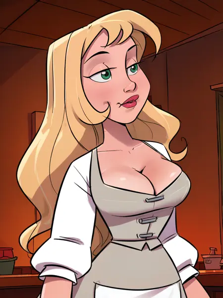 附加项:1个女孩,单独,金发,长发,绿眼睛,口红,棕色短裙,围裙,白衬衫,蓬松袖子,灰色紧身胸衣,中等胸部,乳沟