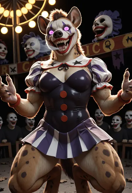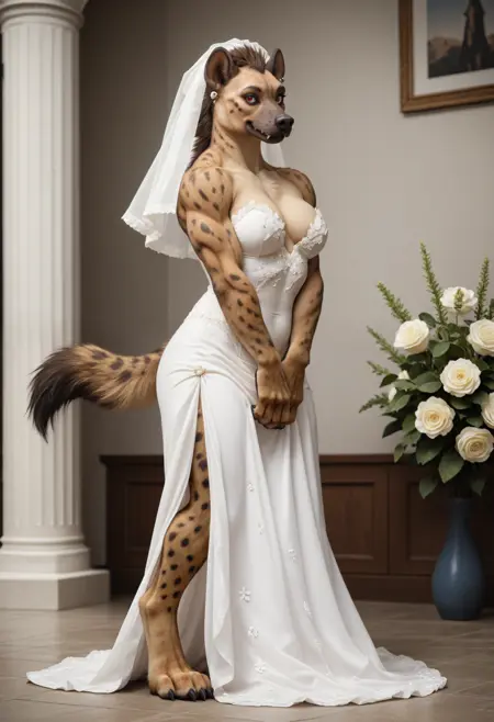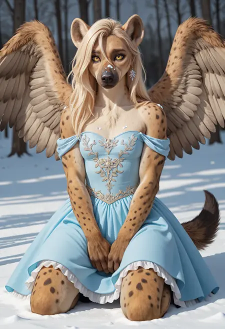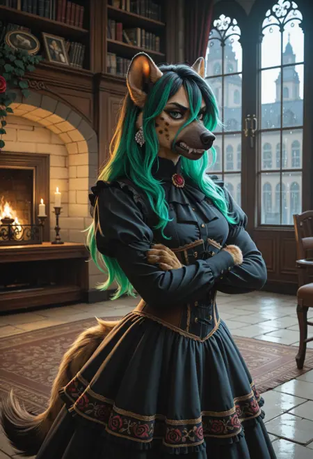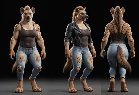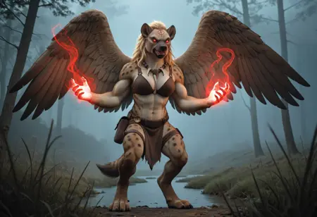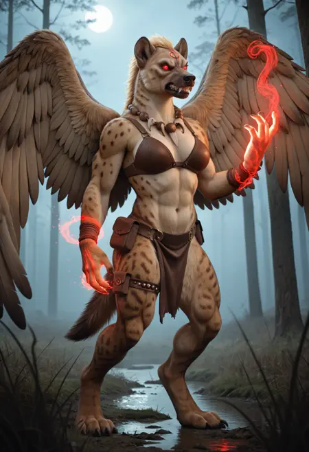 gnoll, 황갈색 털, 붉은 눈, 검은 코, 꼬리, 근육질, 견고함, 하이에나, 갈색 털 mane,